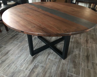Round Live Edge Dining Table / Handcrafted live edge dining and conference tables by real furniture makers, heirloom quality slab tops crafted in kiln dried hardwoods.